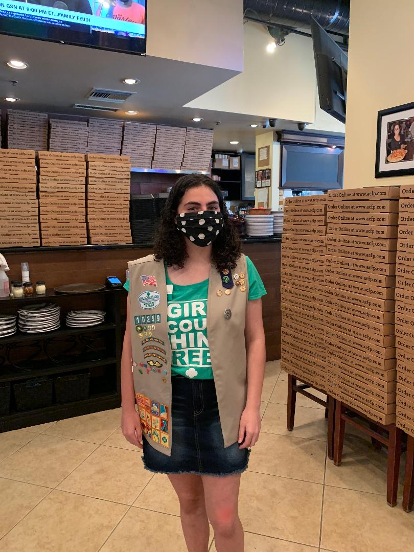 Girl Scout Hannah is on a mission to help children with different developmental disabilities enjoy scouting. Here she is raising money for her project with Anthony’s Coal Fired Pizza in Weston, FL. Image courtesy of Hannah Wagner